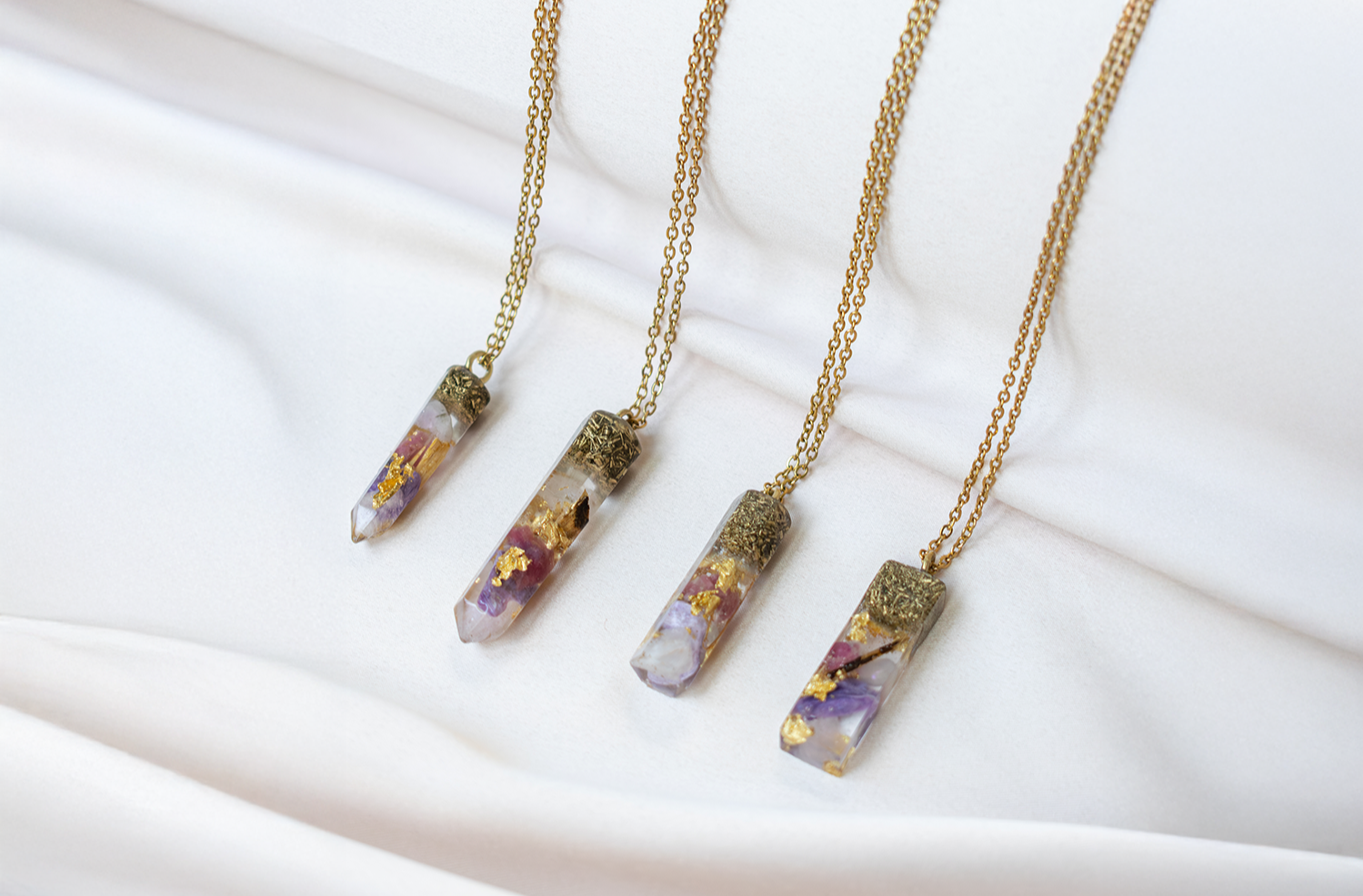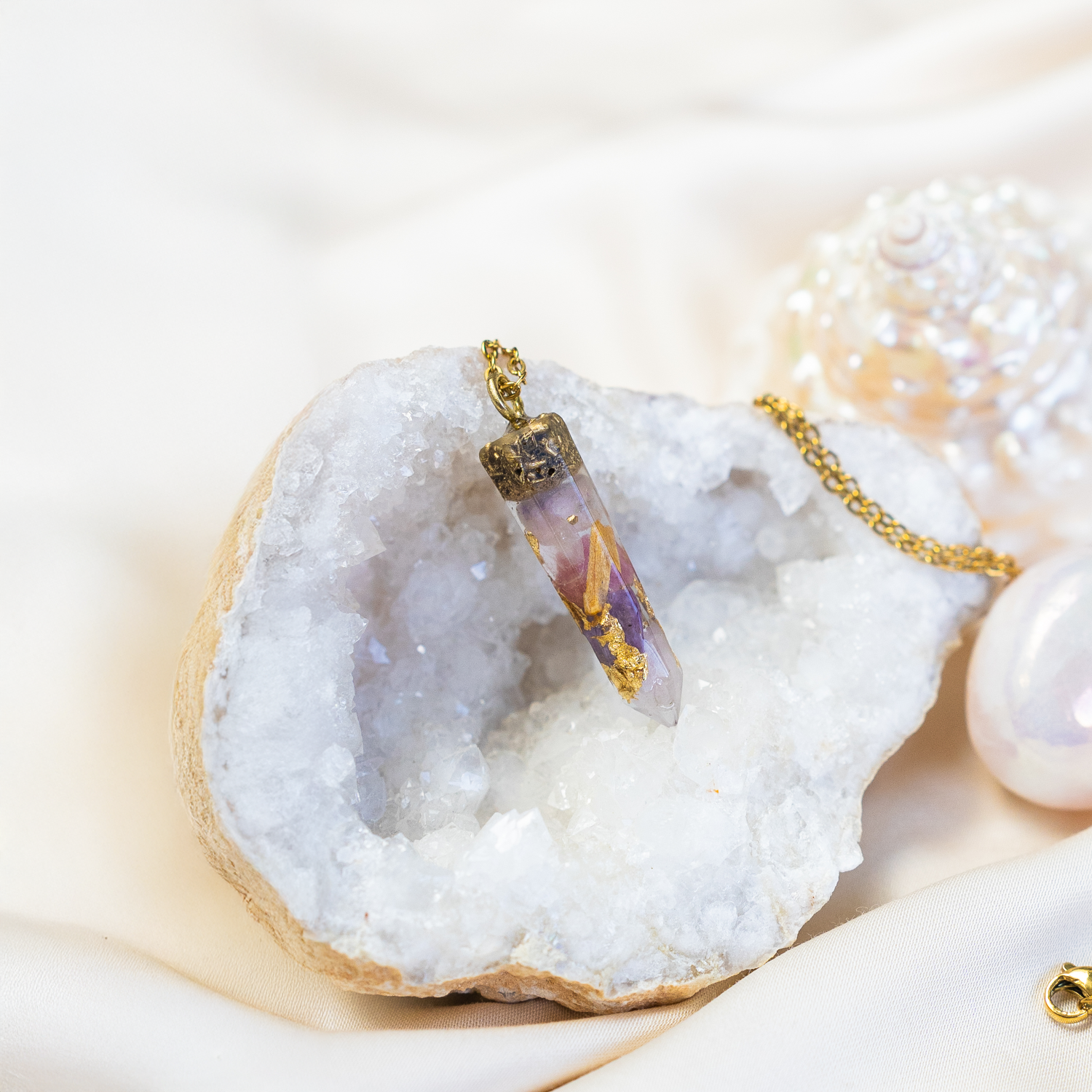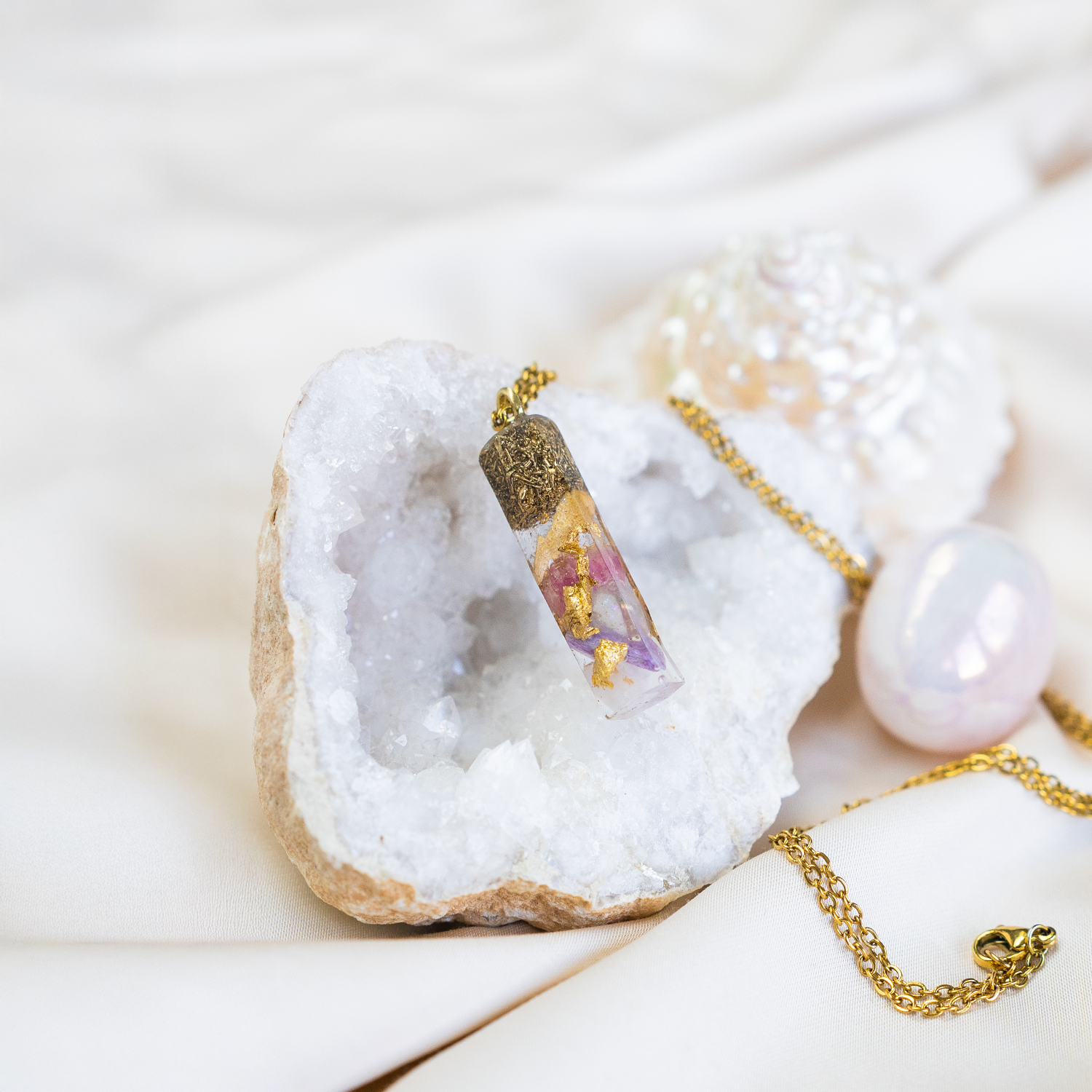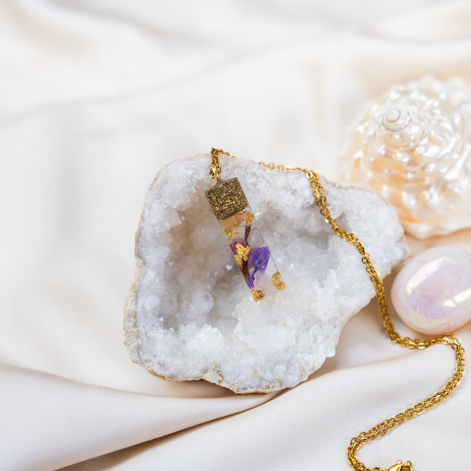 Eco Resin • Gold Flakes • Brass Shavings • Charoite • Aura Quartz • Clear Quartz • Kunzite • Rose Quartz • Pink Tourmaline • Ayahuasca • Palo Santo • Gold-plated Stainless Steel Necklace